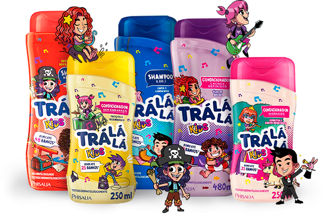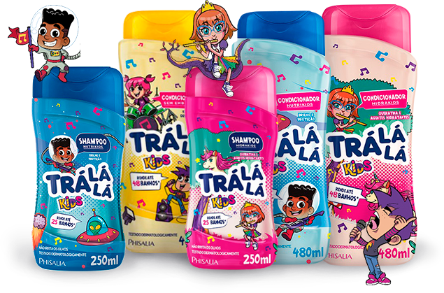 - A Linha 2 em 1 Meninas contém agentes que lavam e condicionam deixando aquele cheirinho gostoso como todos os outros produtos da marca TRÁ LÁ LÁ.