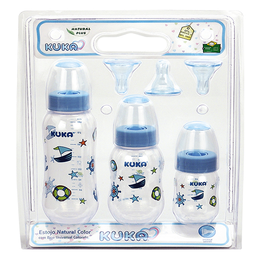 Estojo contém, 01 Mamadeira de 250ml, 01 de 160ml e 01 Mamadeira de 70ml . Todas na cor Azul. 3 Bicos de silicone